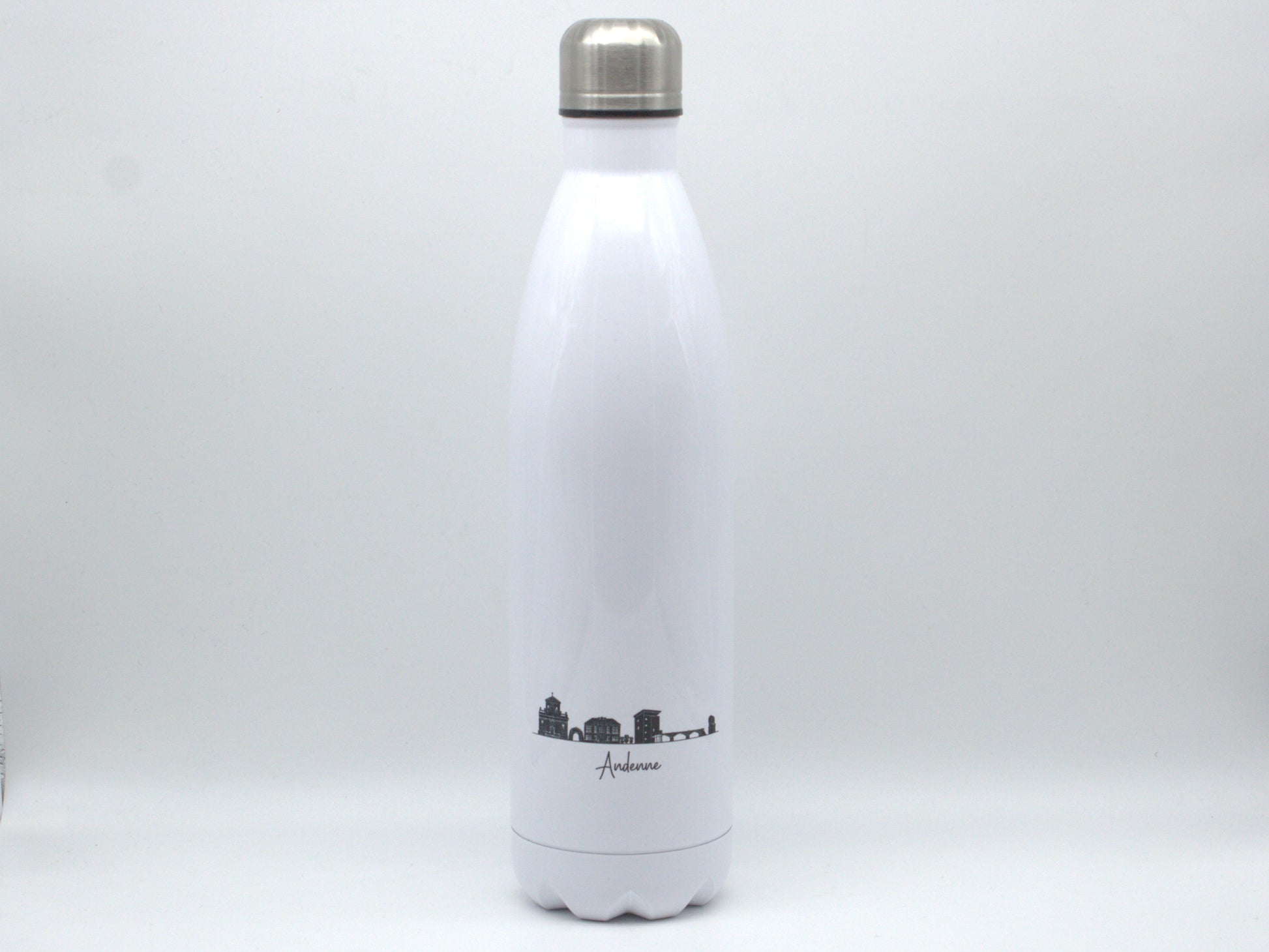 Gourde en inox de couleur blanche, ornée du skyline et de l'inscription "Andenne".
