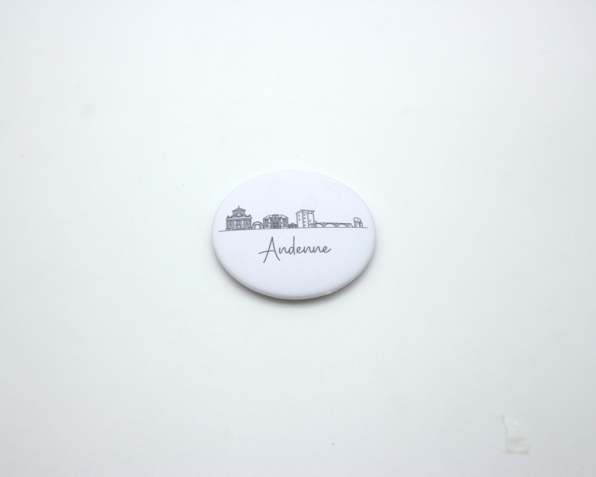Magnet avec une illustration "Skyline " blanche d'Andenne.