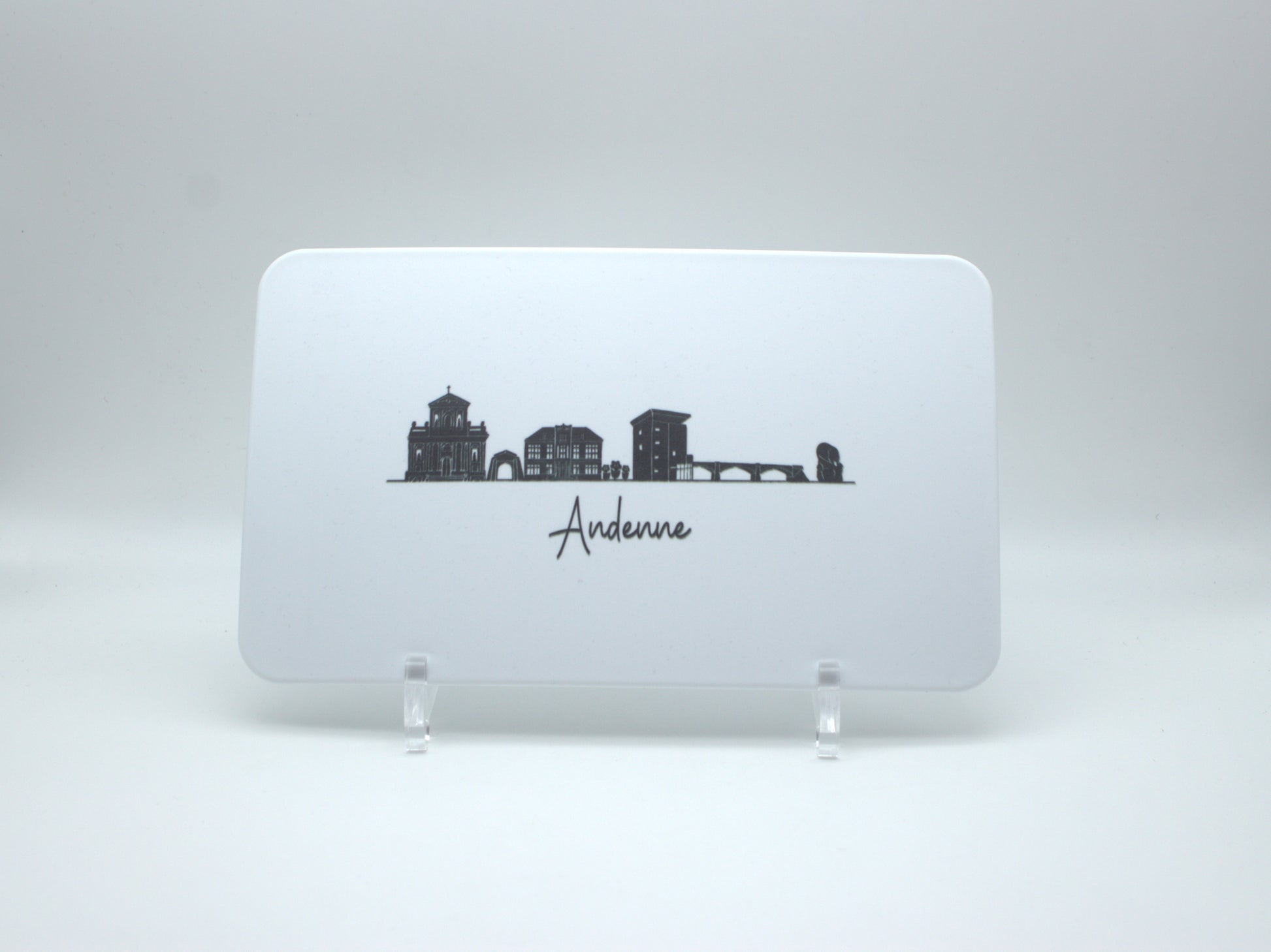 Planche à découper avec une illustration "skyline" noire d'Andenne.