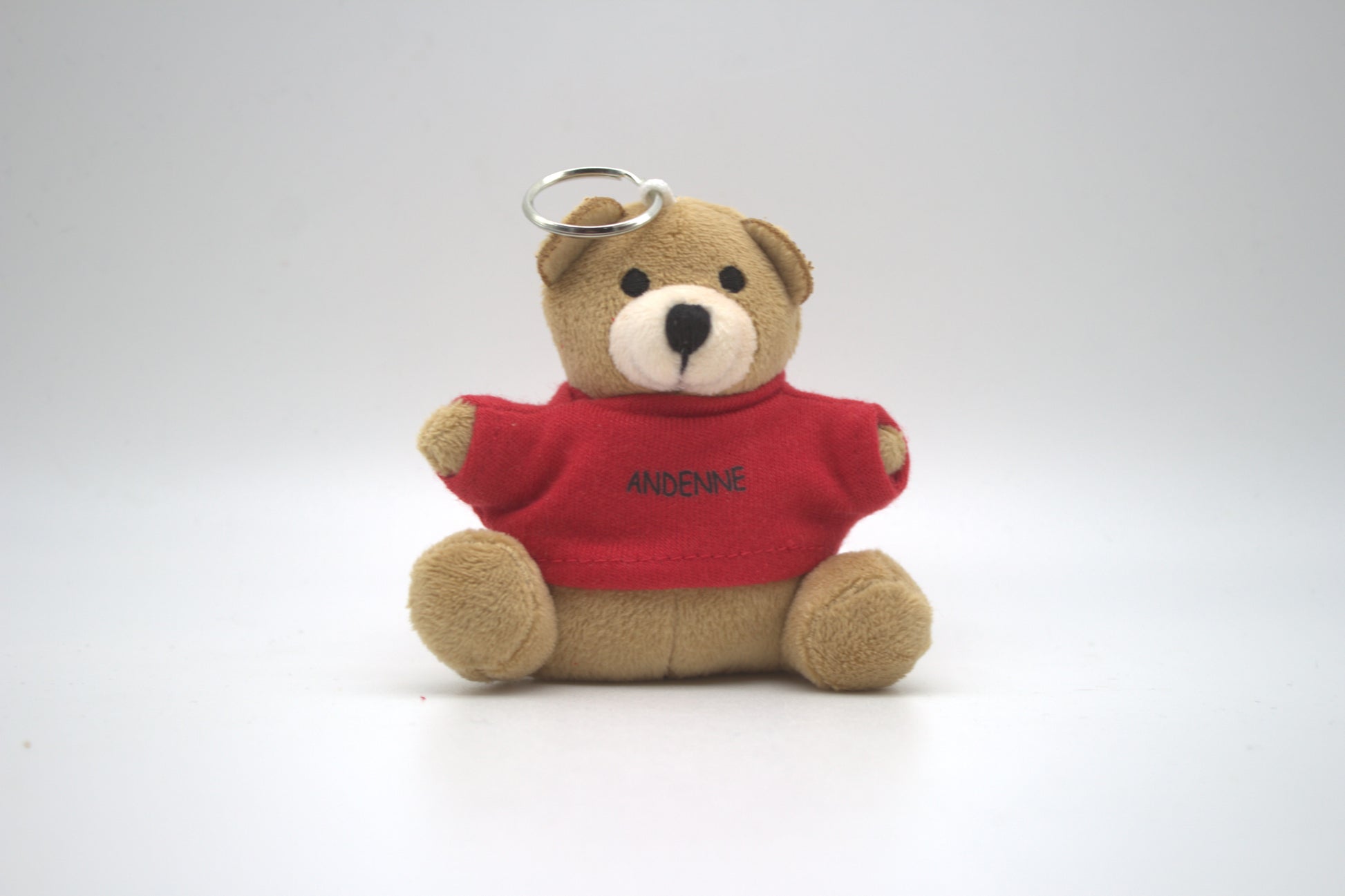 Porte-clés avec une peluche d'ours rouge, ornée de l'inscription "Andenne".